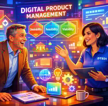 Digital product management frameworks provide structured methods for evaluating such decisions. One widely used model, often discussed in innovation literature at Harvard Business School, is the three-dimensional framework of desirability, feasibility, and viability.